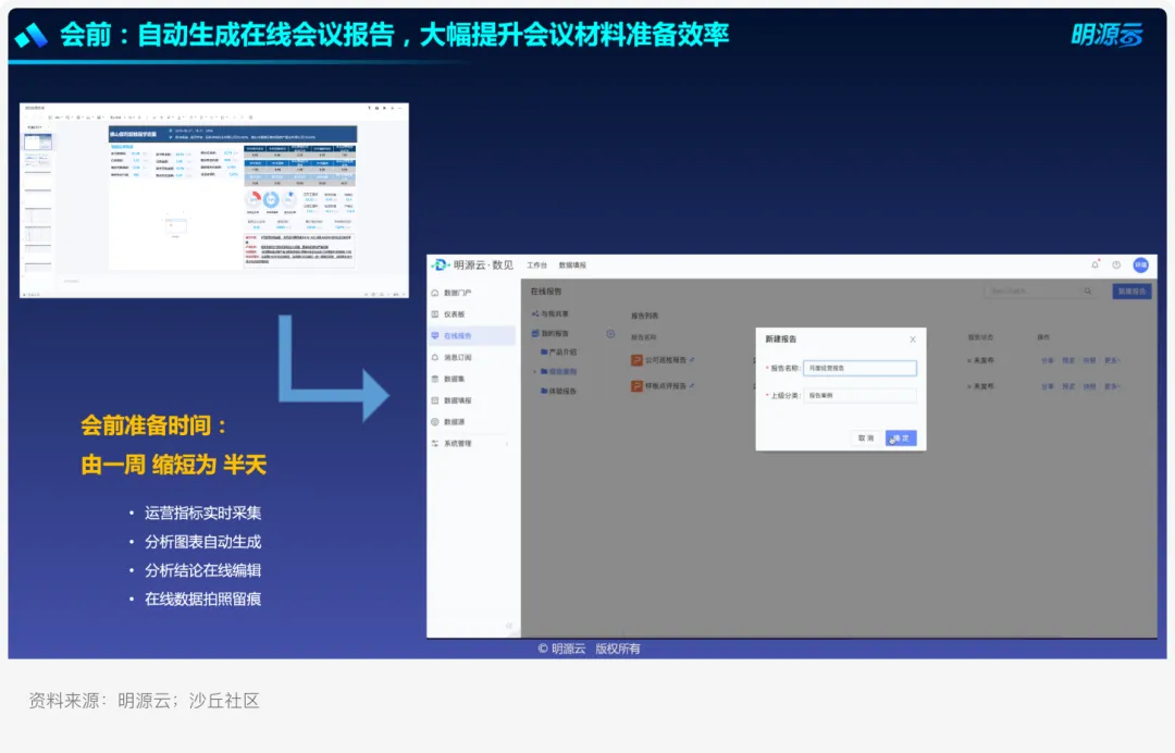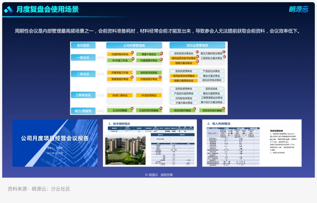 但管理驾驶舱主要展示的是实时动态数据和企业风险数据,无法识别和洞察企业周期性的经营风险。房地产企业形成经营决策通常需要周期性的沉淀,周期性会议是内部管理最高频的场景之一。会议中不可避免的需要呈现各种数据,开会时通过对数据的洞察来识别经营风险。但由于数据复杂,往往会议资料准备耗时较长,材料经常会前才能发出来,导致参会人无法提前获取会议资料,会议效率低下。