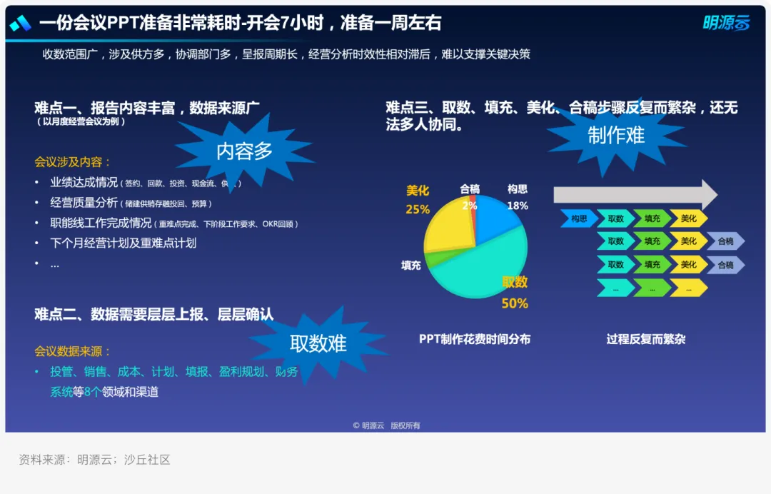 第三,制作难。PPT制作中涉及各种数据图表,取数、填充、美化、合稿的过程反复而繁杂,且无法多人协同。