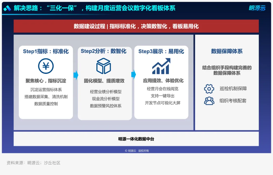 为解决A企业月度复盘会场景的数据应用难题,明源云提出“三化一保”设计理念,构建月度运营会议数字化看板体系: