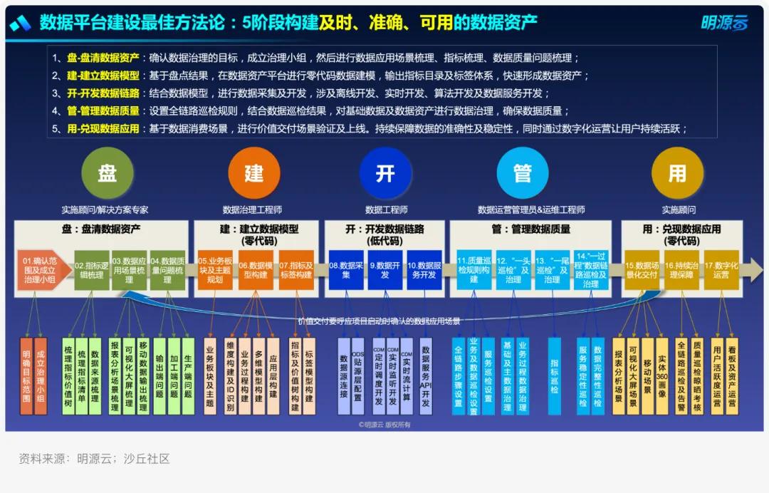 基于众多房地产企业数据治理项目的落地实践,明源云沉淀数据平台建设方法论,通过5个阶段构建及时、准确、可用的数据资产: