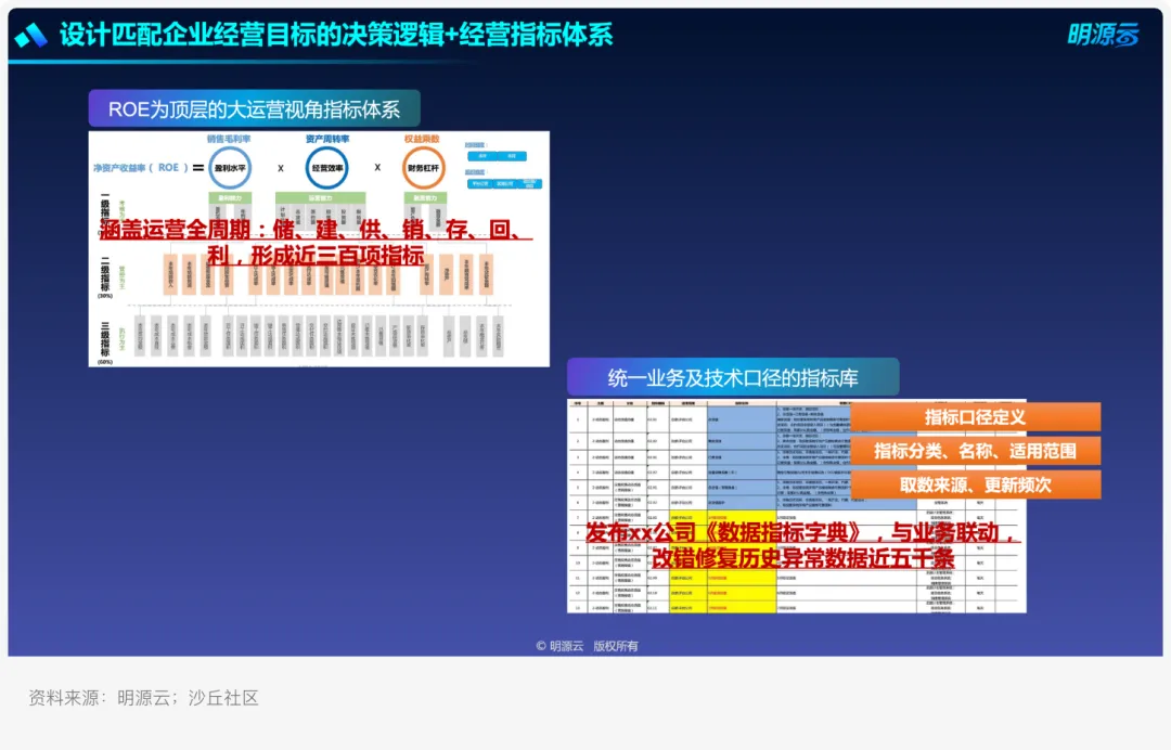 在经营指标体系设计过程中,A企业采取以ROE为顶层的大运营视角来做整个指标的分析,从盈利水平、经营效率到财务杠杆形成一级决策指标、二级管理指标和三级执行指标。明源云协同A企业各级部门,涵盖不动产运营全周期的储、建、供、销、存、回、利的多层决策指标沉淀,共形成近三百条指标。