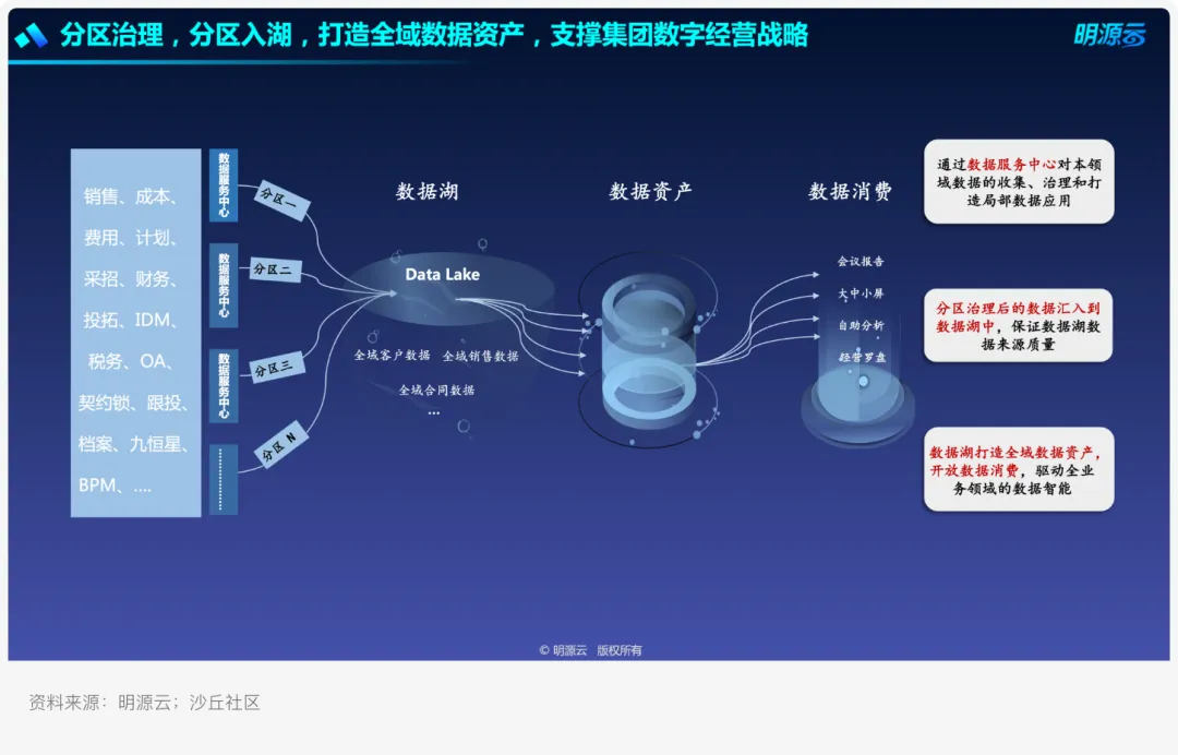 在项目过程中,明源云围绕A企业实际情况,基于决策逻辑,梳理大数据各层DWD、DMI、DWS的建模清单。清单梳理后,通过数据服务中心对本领域数据收集、治理和打造局部数据应用,分区治理后的数据汇入到数据湖中,保证数据湖数据来源质量,数据湖打造全域数据资产,开放数据消费,包括会议报告、大中小屏、自助分析、经营罗盘等,驱动全业务领域的数据智能。