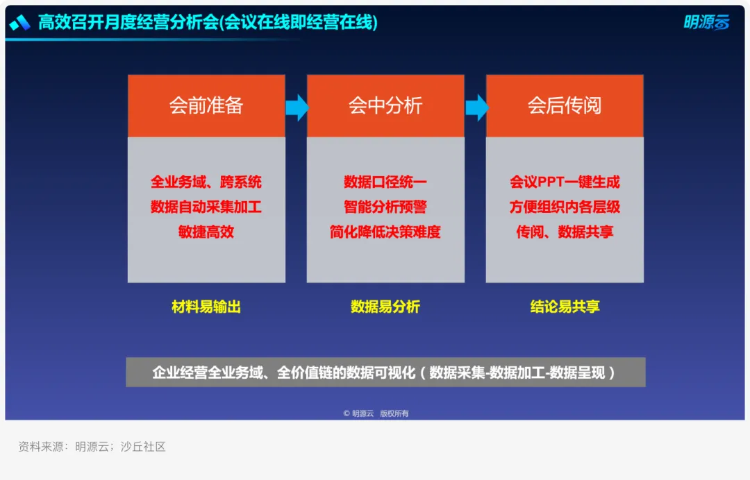 月度复盘会是A企业重要的周期性会议之一,月度复盘会于每个月月初召开,复盘上个月的经营情况。月度复盘会由运营部门牵头,协同营销、销售、采招、财务等各部门,会议召开前一周就开始收集数据,通过人工取数的方式做成汇报PPT用于月度复盘会上的分析讨论。