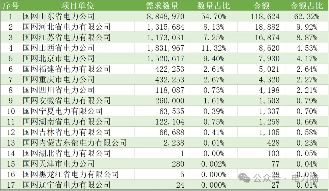 结合中标情况,2023年度国网招标市场总体规模约为19.03亿元。其中,国网山东电力公司约占62.32%;另有国网河北省电力有限公司和国网江苏省电力公司占比都超过5%。