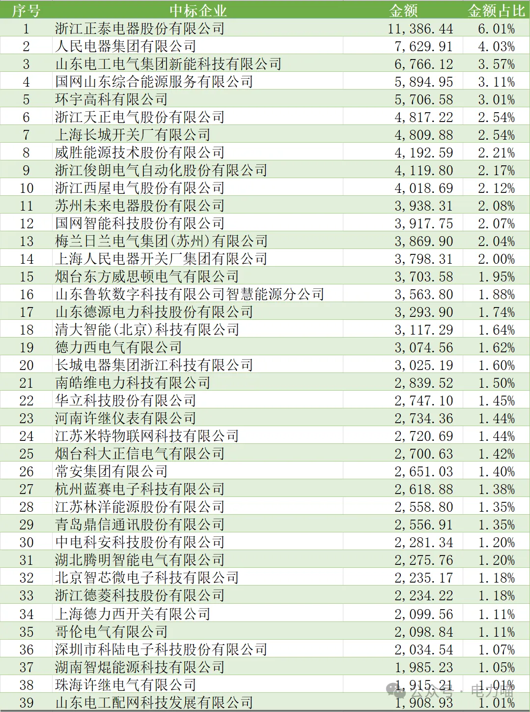 中标金额方面,浙江正泰电器股份有限公司中标金额量最大,占比6.01%;中标金额超过5,000万元的企业共有5家,占比5%;金额占比超过1%的企业共有39家,占比41%。中标金额超过1,000万元的企业共有62家,占比65%。中标金额的中位数是1,975万元,超过中位数的企业共有37家,占比39%。