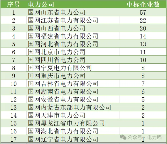 各电力公司中标企业数量方面,在国网山东省电力公司共有57家企业中标,超过10家企业中标的电力公司共有7个。