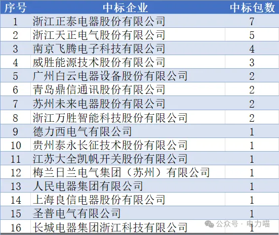 中标企业中,浙江正泰电器股份有限公司中标数量最多,占比7.87%;中标数量超过100,000只的企业共有43家,占中标企业总数量的45%;数量占比超过1%的企业共有33家,占中标企业总数量的34%;中标数量的中位数是168,488只,超过中位数的企业共有32家,占中标企业 总数量的33%。