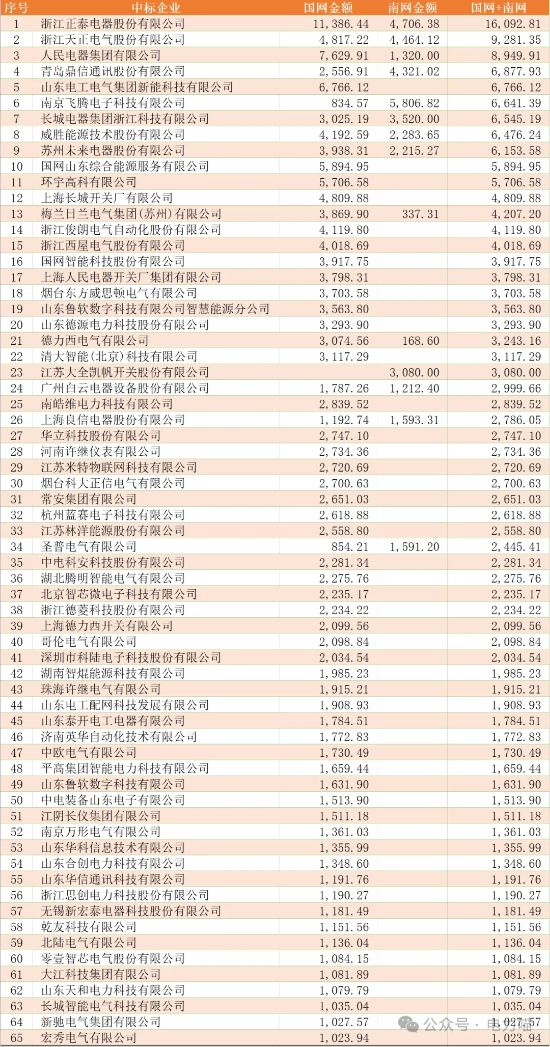 综合国网和南网的中标结果,两网共有109家企业中标,其中共有65家企业中标金额超过1,000万元(与2022年度增加35家)