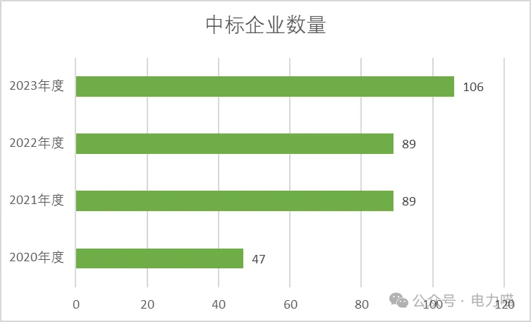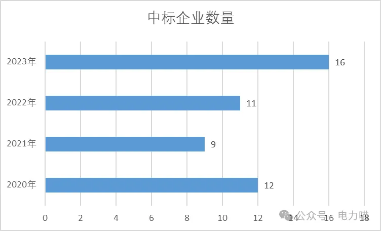 从这三年中标企业数量来看,南网市场竞争激烈程度总体尚可,在2023年度,出现明显变化,近四年第一次中标的企业共有7家
