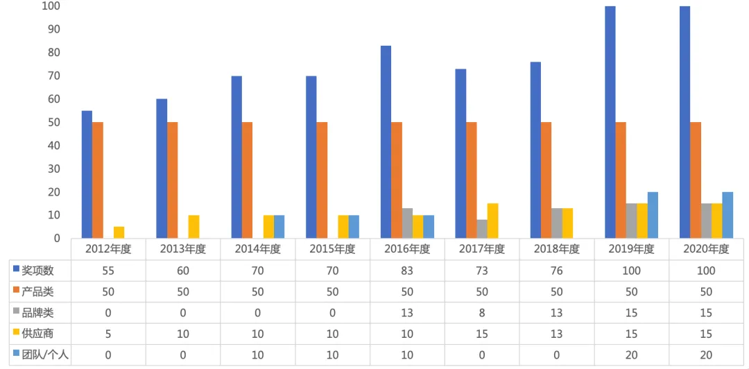 2012—2020年度中国农业机械年度TOP50+奖项设置变化趋势首届也就是2012年度,评选内容仅为产品类和供应商类两个项目,其中产品类分为综合金奖、市场领先奖及金奖、应用贡献奖及金奖以及技术创新奖及金奖。