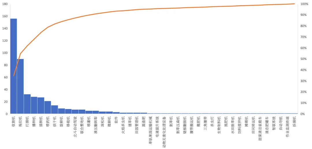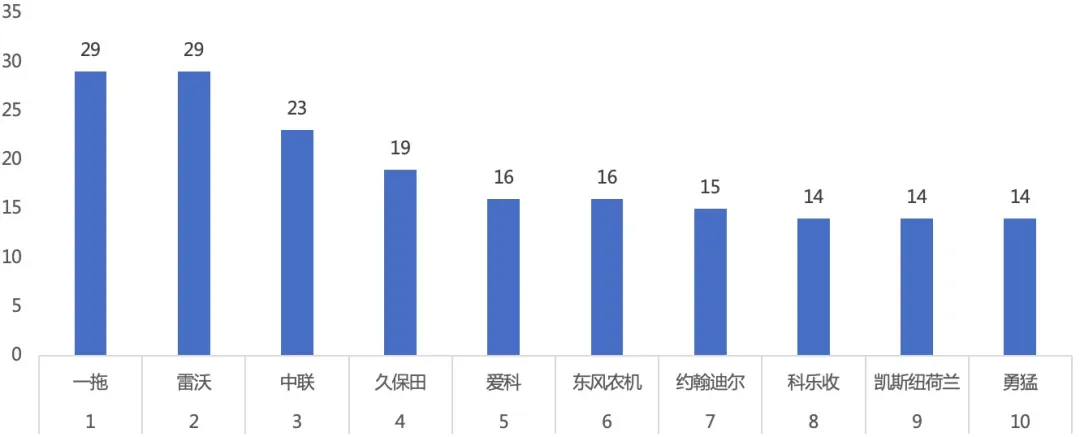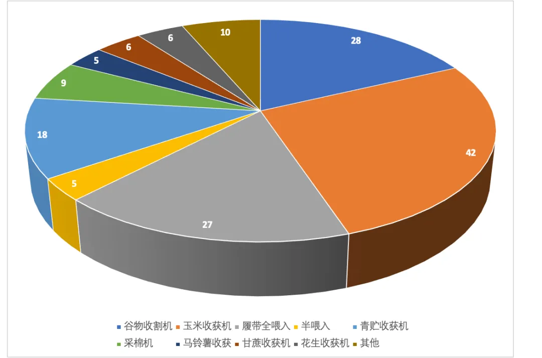 在过去9年里评选的450个年度产品,对技术发展、市场表现以及填补市场空白的贡献等方面,则能够一目了然地看得清清楚楚。各企业的获奖状况,我们将在下文再分析。这里,我们主要考察各类别的产品分布情况。去除上文所说团队、个人及供应商和品牌共237个奖项后,将剩下的450个产品奖项合并同类项,如拖拉机和配附件合并、各类收割机进行合并等,合并前包含团队、品牌和供应商共75类,合并后则只有42类。当然,这里的类和农机分类标准有些不太统一,对于标准分类和实际操作中的某些不匹配,本文不展开讨论,至于本文如何进行此种方式分类,以后我们将会进行专题讨论。总体来说,过去9年共有42类产品获奖,几乎囊括了市场表现有力、技术创新亮眼的大部分产品和技术。入选种类最多的是收割机,共156个奖项,其次是拖拉机90个,之后超过10个的奖项则分别为打捆机、播种机、插秧机、喷药机和烘干机,分别为32、28、27、21和14个。紧随其后的旋耕机9个、移栽机8个,北斗自动驾驶和联合整地机各7个,喷灌设备和液压翻转犁各5个,深松机和微耕机各4个,软件类的有3个,入选2个的分别为火焰杀虫机、搂草机、田园管理机和圆盘耙。此外,有1个产品入选的类别共22个,包括动物无害化处理装备、撒肥机、杀虫灯以及摊晒机等。收割机的156个入选产品中,其细分类别值得关注。过去9年入选收割机类的产品中,玉米收获机占比最高,竟有42个之多,其次是谷物联合收割机和履带全喂入收割机,分别为28和27个,青贮收获机以18个入选位列第四名,其他诸如半喂入收割机、采棉机、甘蔗收获机、花生收获机及马铃薯收获机,也有5个以上的入选产品。单就入选产品种类随9年时间变化,其实就能解读出我国农业装备发展的某些让人印象深刻的发展过程,并能从中发现一些有趣的、甚至是肉眼可见的技术发展趋势,这里不乏许多即将爆发的热点产品,以及呼之欲出的技术需求方向。本节只是探讨获奖类别,下文将专门分析随时间变化不同类别产品以及相关技术的发展历程及趋势,但在此之前,我们先对企业获奖情况进行分析。3.获奖企业分布:企业实力有目共睹
