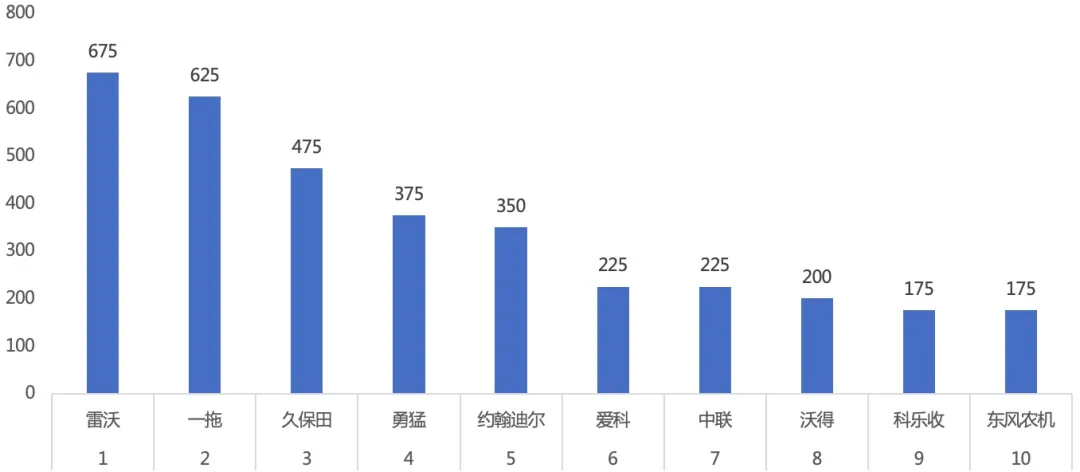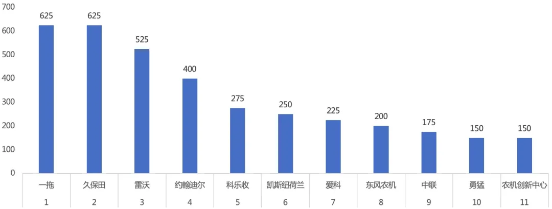 2012—2020年度中国农业机械年度TOP50+获奖总数前十情况具体分析来看,在过去9年获得将近30个奖项的一拖和雷沃名列前茅,平均每年有获得超过3个奖项并列第一,紧随其后的中联和久保田,分别为23和19个获奖记录,也实属不易。同时进入前10名的还有爱科、东风农机、约翰迪尔等国内外知名企业,科乐收、凯斯纽荷兰和勇猛也进入前十行列。按本土企业和外资来区分的话,本土企业在前十中占据了五个席位,和外资企业算是平分秋色。但如果按照积分计算的话,尽管前十企业未有变化,不过具体排序有了轻微调整。一拖、雷沃和久保田位居积分榜的前三名,这里值得一提的是久保田,获奖数量未超过20但总积分却接近900分。紧随其后的是中联和约翰迪尔,进入前十的另外五家企业分别为东风农机、爱科、凯斯纽荷兰、勇猛和科乐收。
