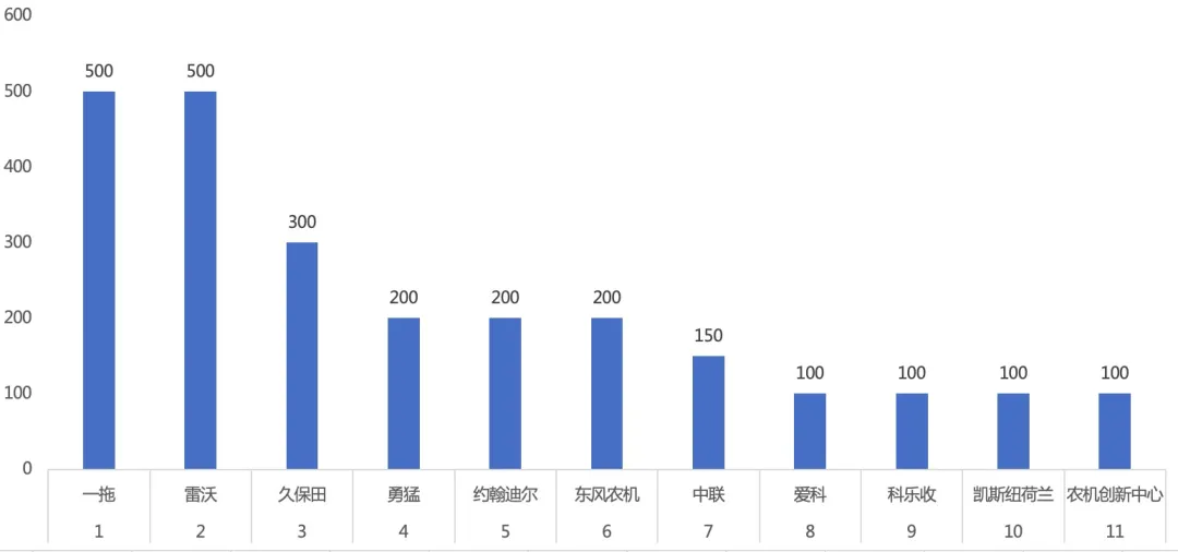 2012—2020年度中国农业机械年度TOP50+应用贡献分前十情况和我们惯性思维认为的国内企业对本土贡献更大一样,在应用贡献模块里,国内企业当之无愧的是大多数,而且很多还并不是多知名的大企业。换句话说,这里隐藏着许多未来的“小巨人”或“印象冠军”。似乎这也验证了一句话:中国的农机化事业,还是要中国本土企业作为主力军去完成的。在这个考察项目里,雷沃和一拖分列第一和第二,与创新力相比,雷沃虽然创新力不是前二,推向市场的胆量和决心似乎比一拖和久保田更大、更高,这似乎很符合行业对这家企业的认知。当然,久保田和凯斯纽荷兰以及约翰迪尔,分列应用贡献的三、四、五名,可见外资企业对中国农机化事业的发展,应该是有贡献的。爱科和科乐收也进入此项榜单前十,分别位列第六和第九,另外三个进入前十的企业分别为第七位的现代农装、第八位的中联和第十位的富来威。把品牌和人才放在一起总结,是因为这两者均是企业软实力的体现,像是一个硬币的两面——品牌是表面,大家看得见的光鲜;人才是背面,是企业辛苦培育而别人无法一眼就看出来的一面。
