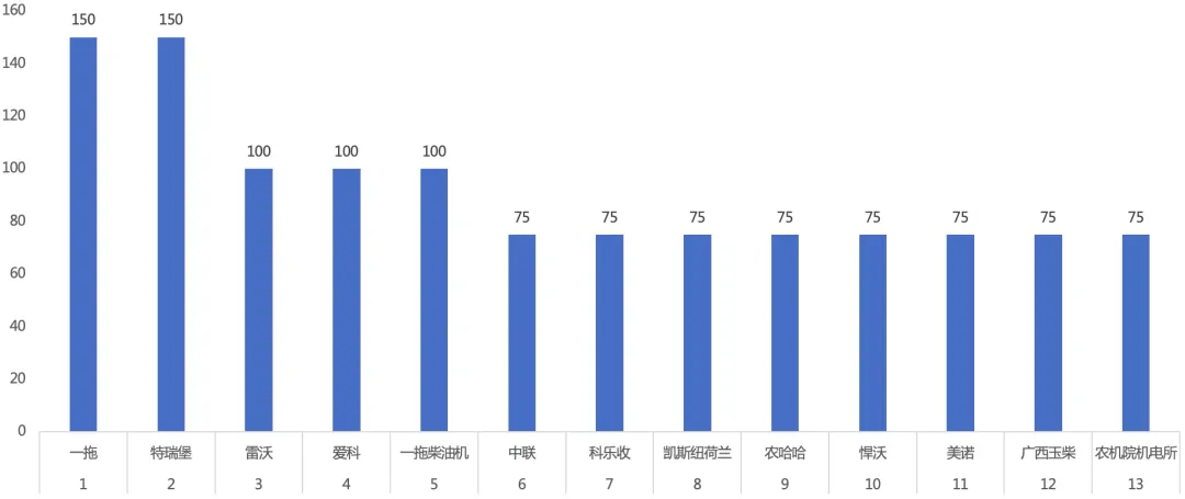 其中,综合金奖为2个,一个是拖拉机,一个是收获机械。也因此,在2016年度将此奖项升级为“年度拖拉机”和“年度收获机”。当然,这绝非是巧合,而是在创立这个颁奖活动的时候,就进行了前瞻性的研究和布局。市场领先、应用贡献和技术创新3类奖项,分别设金奖3个和银奖或叫普通奖项13个,共计产品奖项50个。由于供应商分门别类,种类繁多,除首届和《农业机械》杂志创刊55周年凑“55”之数,在50个产品奖项外设5个供应商奖项,后逐渐增加到10个及以上。其中,2017年度尝试将供应商奖项有所区别,设置了优秀配套件供应商和发动机奖项,分别为5个和10个;2018年度首次设置金牌供应商奖项,共3个获奖名额,其余10个为优秀供应商;2019年度至今,供应商奖项区分为金牌供应商和优秀配套件供应商两类,前者5个获奖名额,后者10个入围。品牌类奖项是为了响应“国家品牌日”设立而产生,自2016年度首次开展评选,设立最具品牌影响力的大奖金穗奖3个和最具成长力品牌金禾奖10个;下一年度金穗奖和金禾奖分别为3个和5个获奖名额;2018年度恢复成2016年度3+10的格局,即3个金穗奖和10个金禾奖;2019年度至今,稳定为5个金穗奖和10个金禾奖。团队/个人奖项因可变性、不可预测性等较大,评选也容易出现争议。自2014年度引入年度人物评选后,一直在探索新的评选方式。2014—2016年度先后开展了3次年度人物的评选,分别设立年度人物1人,年度工程师、年度突出贡献人物及年度营销人物/团队各3个,每年度共10个奖项。其中年度营销人物在最后一年也就是2016年度,改为年度营销团队。在暂停了2年之后,组委会经过听取企业、行业等意见,重新组织以年度团队的方式进行评选,分设年度管理、营销、服务和技术4类,每类5个团队入选。获奖总数由最初的55个到如今的100个基本保持稳定,其中产品类一直为50个,在行业中称为“中国农业机械年度产品50强”,也就是我们官方定义的“TOP50”。后来的官方称呼改成“TOP50+”,后面的“+”实际就是加入了供应商、品牌及团队/个人。经过9个年度的评选,中国农业机械年度评选活动在记录农机行业发展历史的同时,对判断市场风向、促进技术进步,甚至是对促进企业技术、营销和管理等内部健康发展,都起了一定的作用,我们接下来继续分析。