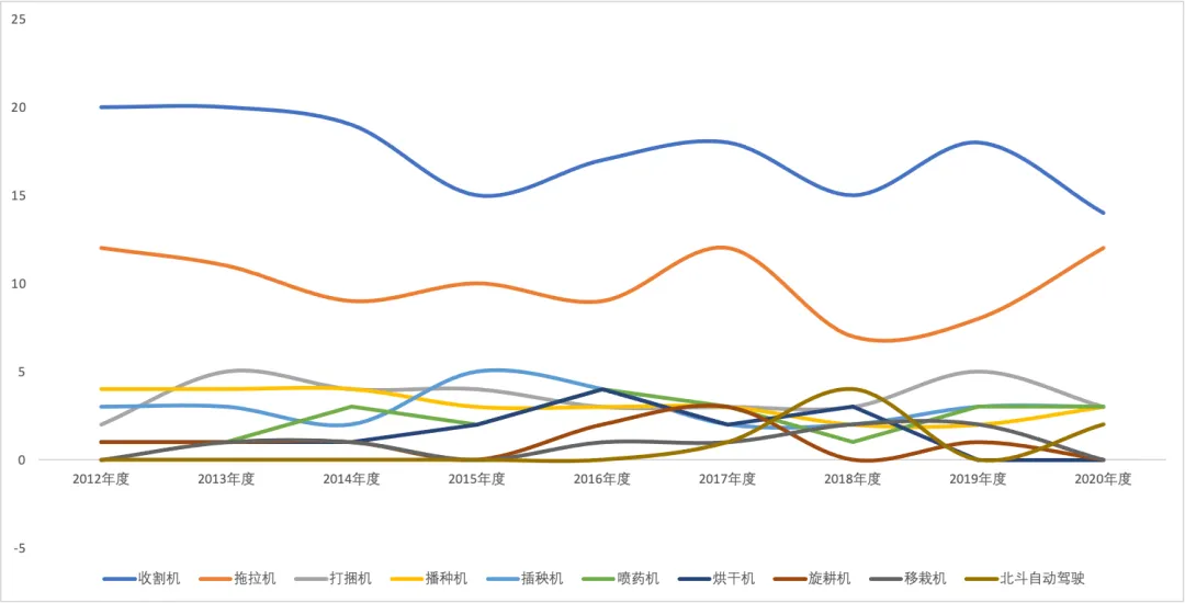 2012—2020年度中国农业机械年度TOP50+分类产品走势年度评选基于多个维度,如市场、技术和人才、品牌等,特别是对技术与市场的记录,既能够很好的还原历史,还能够一目了然地看到一些行业发展趋势。如联合收割机除了喂入量增加,还有什么提升?拖拉机未来的发展方向将是什么样的?玉米籽粒收获能否赢得未来?诸如此类问题,看到这份连续9年的评选结果,似乎都能够找到答案。考察过去9个年度的评选结果,很多产品的趋势还是能比较明确看出来的。先来看市场热点分布。以数量最多的收获机械和拖拉机为例,在这9个评选年度里,收获机械是具有波动性地走轻微下坡路,而拖拉机则正好相反,是在波动中微微上扬。分析原因不难看出,随着作业类型的增加,也就是全程机械化和全面机械化的推广,拖拉机所带的农机具种类不断增加,工作时间和工作类型提升导致使用频繁,对拖拉机市场多样性及技术创新的需求越来越多。