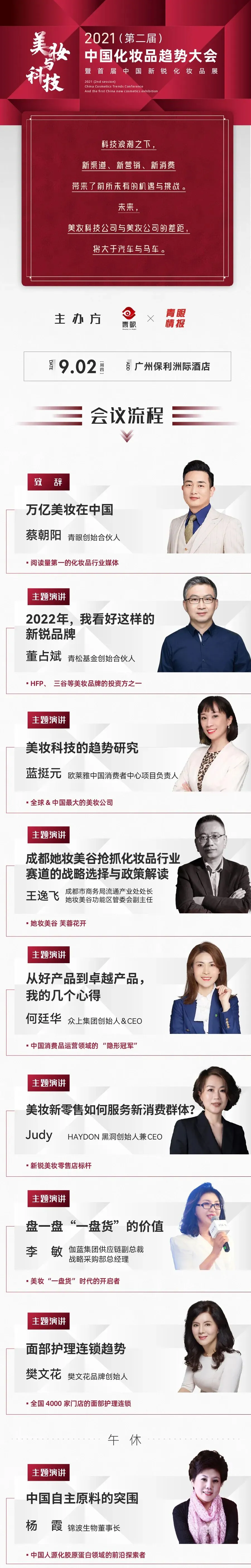 9月2日,青眼将在广州保利洲际酒店主办2021(第二届)中国化妆品趋势大会暨首届中国新锐化妆品展。“她妆美谷”作为本次趋势大会的战略合作伙伴,携手青眼共同掀起一场化妆品行业趋势的头脑风暴,助力行业高质量发展。
