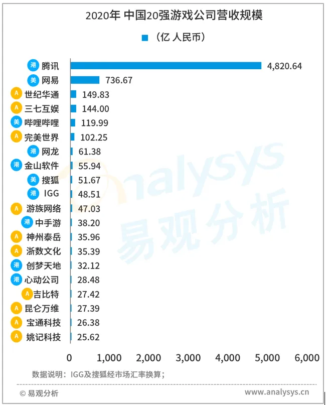 2020年中国20强游戏公司营收规模