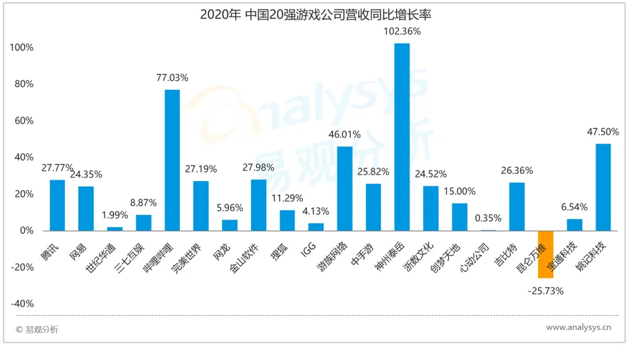 2020年中国20强游戏公司营收同比增长率