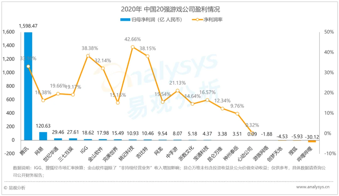 2020年中国20强游戏公司盈利情况