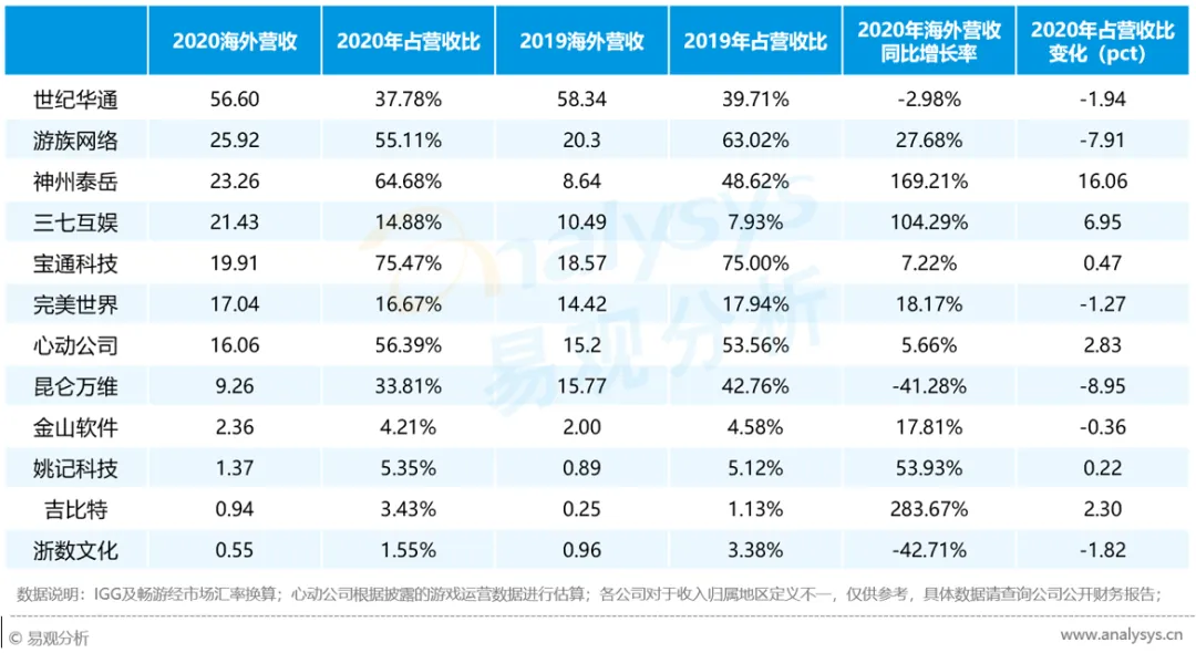 2020年中国部分20强游戏公司海外营收占比情况