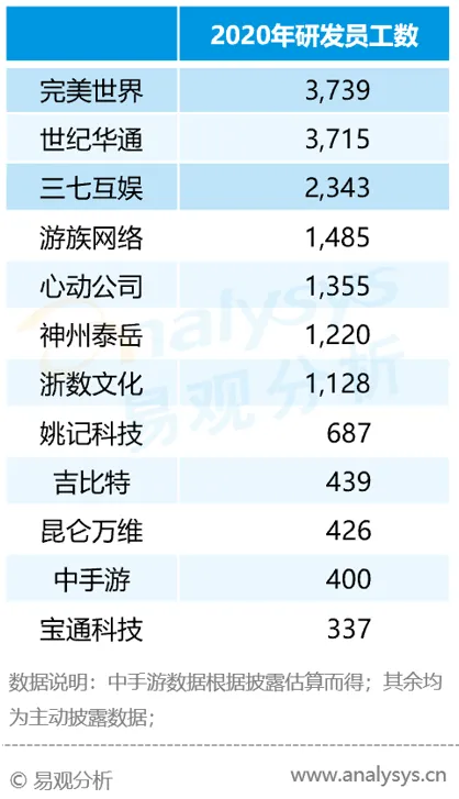 2020年中国20强游戏公司(部分)研发团队规模