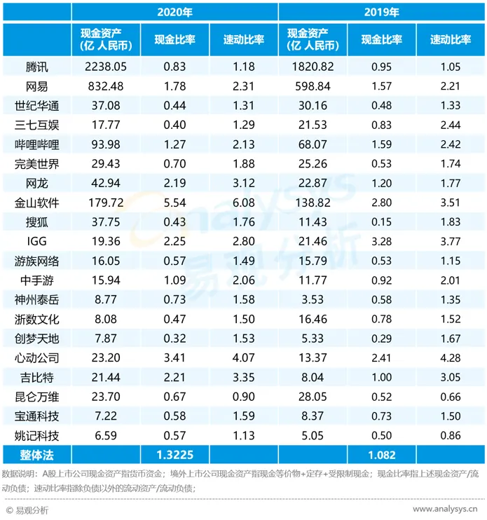 2020年中国20强游戏公司现金及相关比率情况