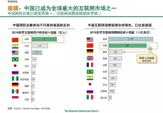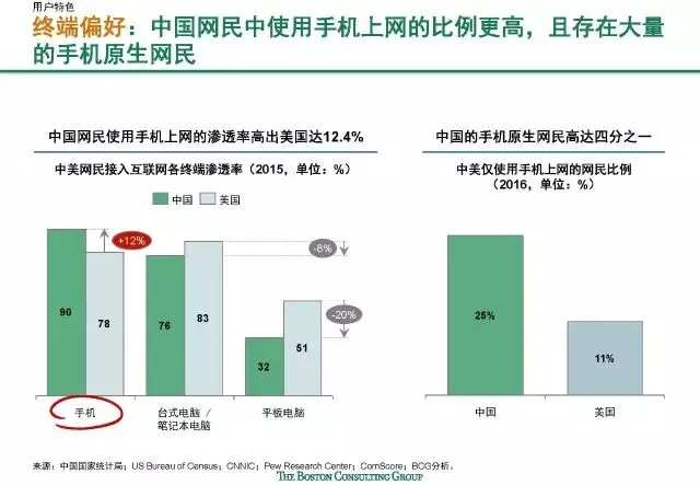 宏观层面来看,中国、美国俨然已成为驱动世界互联网发展的双引擎。但微观层面而言,两者在市场发展阶段、用户特征、竞争格局、企业创新特点等方面都迥然各异。