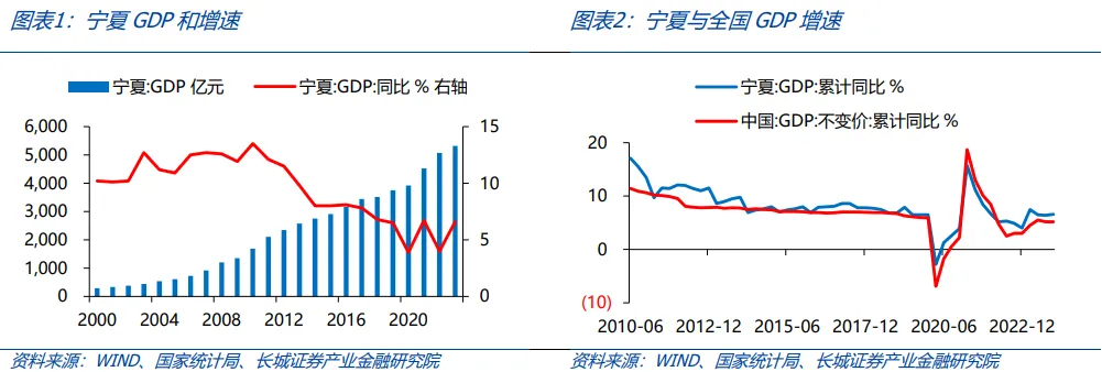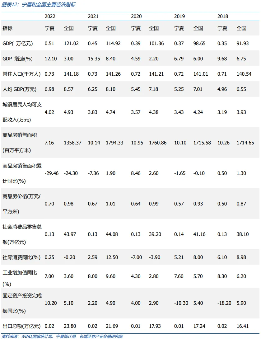 宁夏位于中国西北部地区,是全国唯一全境属于黄河流域的省区。位处中国能源化工“金三角”,资源丰富,“六新”产业潜力巨大;宁夏还拥有完整的山水林田湖草沙生态体系,被称为“塞上江南”,“六特”产业优势突出。首府银川是“一带一路”重要节点城市、国家向西开放的重要窗口。近年来,随着“六新六特六优”的提出,第一产业提质发展,第二产业逐渐向高新技术转型,第三产业增长潜力巨大。背靠“一带一路”,宁夏抓住机遇,积极与相关国家进行贸易往来,出口和民营经济都逐渐复苏回暖。2021年2月,中国脱贫攻坚战取得全面胜利,宁夏也圆满完成脱贫攻坚任务,实现了80.3万农村贫困人口全部脱贫。