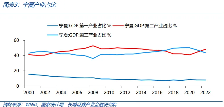 2022年宁夏三次产业结构为8.0:48.3:43.7,与全国三次产业比重的7.3:39.9:53.4相比,第一、二产业占比较高,第三产业占比略低。在31省市中,宁夏第二产业占比达到第四名,但从绝对值上比较,第二产业GDP规模排名全国第28。实际上,2018-2021年第二产业占比都在45%以下,2022年有较大的提升,2023年前三季度在46%左右。从产业政策来看,宁夏在2022年首次提出要重点发展“六新六特六优”,“六新”和“六特”分别对应第二和第一产业,而第三产业对应的“六优”正在快速崛起,未来宁夏第三产业占比或将继续上升。