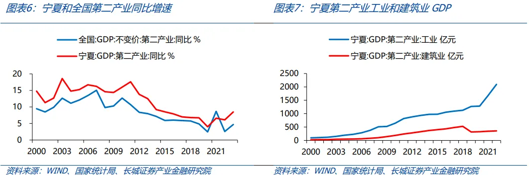第二产业中,工业占比高于全国水平。宁夏工业起步于1958年,成长于三线建设时期,改革开放后,工业经济进一步发展壮大。“三线”建设时期,形成了以煤炭、电力、化工、冶金、有色、装备制造、轻纺等行业为支柱的工业体系。第二产业增速相对全国较高。除2021年外,2010-2023年第二产业增速持续高于全国水平。2023年前三季度,第二产业累计同比增加8.0%,高于全国水平的4.4%。从结构上看,2022年第二产业工业产值2094亿元、建筑业产业357.2亿元,工业占比85.4%,而全国第二产业中工业占比为82.59%,工业占比高于全国水平。