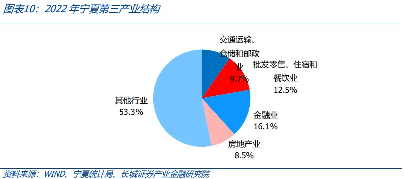 分产业结构看,金融业、批发零售、住宿、餐饮业和交通运输、仓储、邮政业分别占据第三产业的前三位。金融业发展相对占优,占第三产业GDP 比重从 2010 年的 12.85%(全国同期为 14.1%), 到2022 年的 15.91%,略高于全国水平14.5%。《宁夏金融运行报告2023》指出,2022年银行业发展良好,各项贷款增长加快,证券业运行稳健,基金销售较快增长。2022 年末人民币贷款余额 8885 亿元,同比增长 7.3%。其中涉农贷款、普惠小微贷款、科技型中小企业贷款、 绿色贷款、制造业中长期贷款增速均高于全部贷款增速。2022 年 12 月份,企业贷款加权平均利率为 4.37%,同比下降 0.58 个百分点,其中小微企业贷款加权平均利率为 4.65%,同比下降 0.72 个百分 点,均处于近年来最低水平。2022 年末,宁夏上市公司总市值 1619 亿元,全年实现再融资 0.4 亿元。销售开放式基金 232 亿元,同比增长 25.7%。区域股权交易所设立“专精特新”板。发行公司信用类债券 74 亿元,是上年的 2.4 倍。