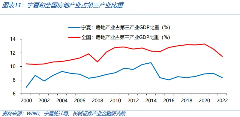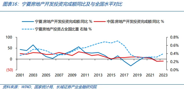 房地产投资方面,宁夏房地产投资波动相对较大,近年来呈下行趋势。2001-2011年,宁夏房地产开发投资同比年平均为33.25%,快于全国的25.4%;2012-2022年,宁夏与全国同比增速均值分别为3.6%和7.5%,增速大幅下滑,表明宁夏房地产下行压力较大,对经济发展的贡献作用下降明显。我们认为原因在于2012年后,宁夏工业发展遭到一定的阻力,GDP和城镇人均可支配收入增速换挡,宁夏房地产投资开发完成额增速在2012年后也逐步下滑,导致对房价的拉动效应不强。
