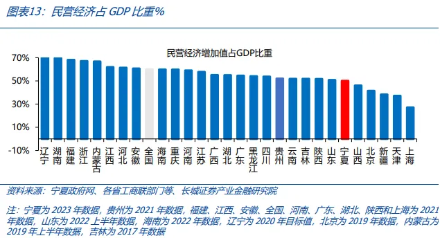 民营经济发展相对较快,发展空间较大。2024年1月5日,宁夏发改委副主任庞伟介绍说:“民营经济是推动宁夏发展不可或缺的重要力量,贡献了近50%的GDP、近50%的税收、近60%的研发投入、近80%的城镇就业、90%以上的经营主体。”同时需注意到,民营经济增加值占GDP比重约为50%,位于全国中下水平,未来仍有进一步发展的空间。