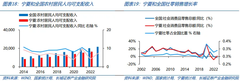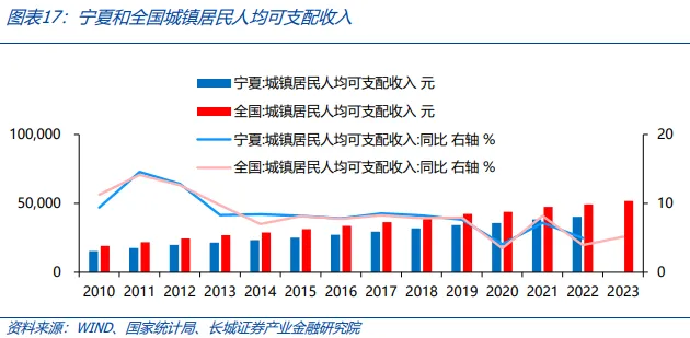从收入角度看,近年来宁夏收入增速稳定,圆满完成脱贫目标。从收入来看,宁夏居民人均可支配收入增速几乎与全国水平同步,但人均可支配收入的值与全国平均水平依然有所差距。2022年宁夏与全国居民人均可支配收入分别为4.0和4.9万元,占比达到81.6%,这一比重略高于2014年的80.7%。2014-2022年,宁夏人均可支配收入增速的平均值为7.22%,略高于全国水平7.17%。可见宁夏居民收入增长紧跟全国步伐,绝对水平仍有进一步提升的空间。2023年1月宁夏自治区政府工作报告汇报了5年来脱贫攻坚的成果,推动巩固拓展脱贫攻坚成果同乡村振兴有效衔接,脱贫人口人均纯收入增长16.3%,脱贫县农村居民人均可支配收入增长8.5%,实现了“两个高于”目标,进入全国前列。全体居民人均可支配收入增长6.1%,其中城镇和农村居民人均可支配收入分别增长5%和7.1%,在全国的排位分别是第六位、第五位、第四位,在西北五省(区)的排位均为第一位。