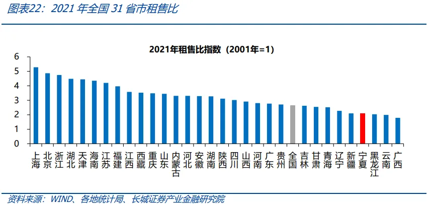 我们以2001年为基期,引入售租比指数(房价指数/房租指数)衡量房价与租金比值的变化。售租比越高,表明房价相对房租增长更快,一定程度可以显示房价泡沫化程度。2001年之后,宁夏售租比走势与全国水平基本一致,与其他省市相比处于偏低位置,可以说宁夏房价“泡沫”相对较小。