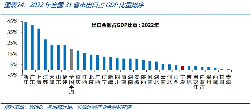 同时也要注意,宁夏出口对GDP贡献不高,2022年出口占GDP比重3.88%,位居全国第24位,明显低于全国平均水平(19.8%),仍有较大的提升空间。