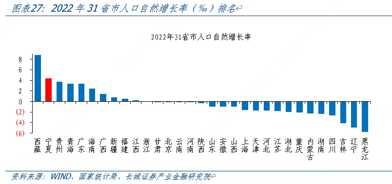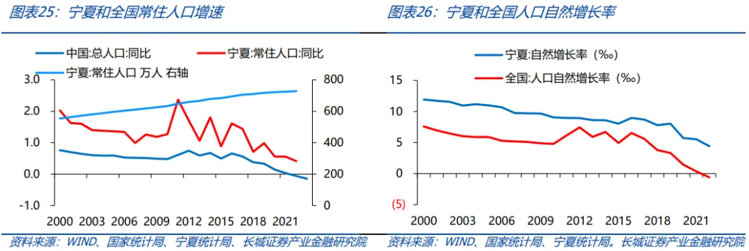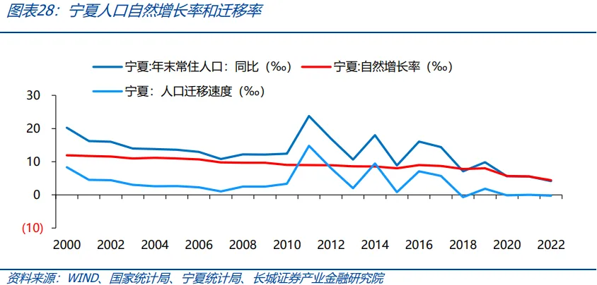 宁夏人口增长边际放缓,但人口自然增长率依然名列前茅。2000年-2020年常住人口稳定增长,从 2000 的 554 万人升至2022年的 728 万人。不过宁夏和全国人口自然增长率都呈现出长期下降趋势,宁夏增长率高于全国水平。2022年宁夏人口自然增长率4.41 ‰,在31省市中排名第二位,仅次于西藏。