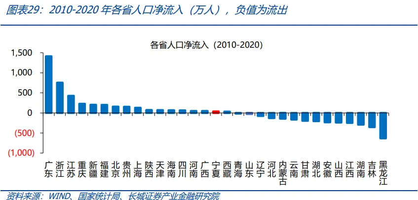 2001-2019年,宁夏常住人口增速基本高于其人口自然增长率,说明人口处于净流入状态。其中2018年小幅净流出;2020-2022年常住人口增速均略低于人口自然增长率,人口总数基本维持平稳。总体来看,2010-2020年宁夏常住人口净流入36.3万人,排名全国第16位。