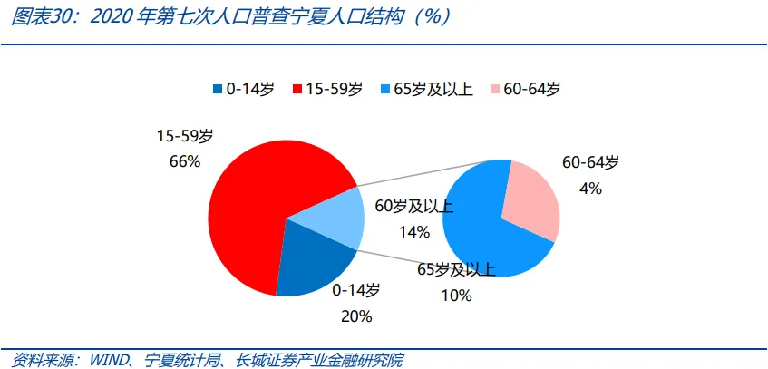从年龄结构看,宁夏老龄化相对较轻。根据2020年第七次人口普查结果,全区常住人口中,0-14岁人口为1468004人,占20.38%;15-59岁人口为4760508人,占66.09%;60岁及以上人口为974142人,占13.53%,该比例与全国平均水平13.5%相差不大;其中65岁及以上人口为692824人,占9.62%。与2010年第六次全国人口普查相比,0-14岁人口的比重降低1.10个百分点,15-59岁人口的比重降低2.85个百分点,60岁及以上人口的比重上升3.95个百分点,65岁及以上人口的比重上升3.21个百分点。按照国际通用划分标准,宁夏人口处于“轻度老龄化”阶段。2020年,宁夏出生率为11.59‰,高于全国平均水平8.52‰。在高出生率带动下,宁夏未来的老龄化程度可能轻于其他省份。
