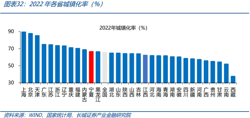 宁夏的城镇化率基本与全国平均趋势保持一致。城镇化率从2000年的32.54%上升至2020年的64.96%,一直保持稳步增长态势,紧紧跟随全国城镇化的步伐。2022年宁夏城镇化率66.34%,在31省市中排名第11位,高于全国平均水平。根据宁夏目前的发展态势,其未来仍有进一步城镇化的空间。