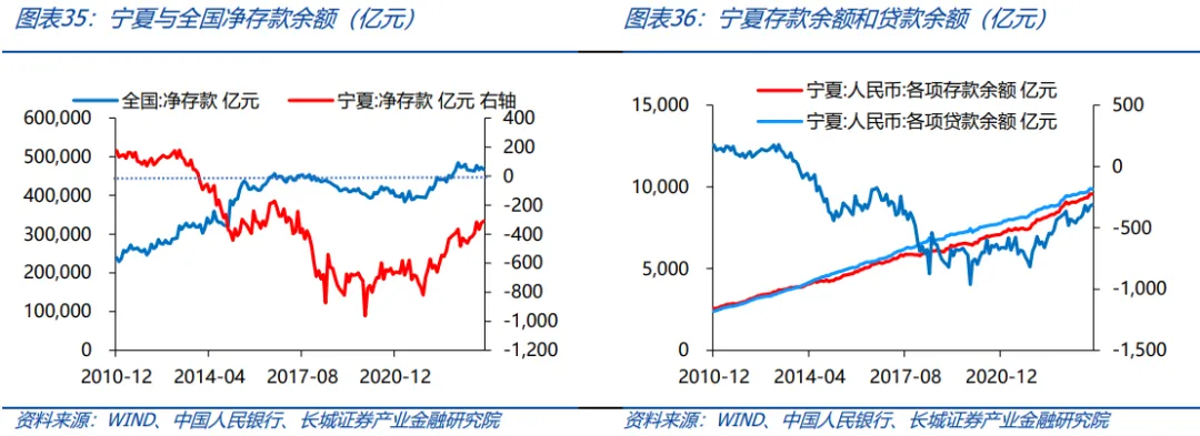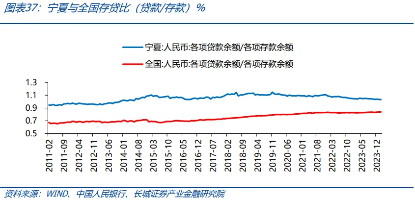 宁夏企业盈利能力相对较弱,股权融资或其他融资渠道相对受限,导致净存款处于负值。2011年起,宁夏的贷款增长快于存款增长,净存款快速减少,2013年末,净存款转负,截至2024年2月仍未回正。2019年11月净存款达到最低点,后续存款余额增长快于贷款余额,我们预计在未来一段时间内,净存款有望恢复至正值。从存贷比来看,2023年11月,宁夏贷款/存款为1.03,远高于全国贷款/存款的0.83。