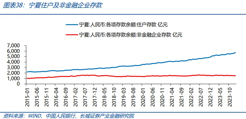 从存款端来看,居民存款增长较快,远快于企业存款的增长。2015年至2023年居民存款从2182.07亿元增长至5525.87亿元,企业存款从1037.98亿元增长至1538.68亿元。居民存款增幅达到153%,是企业存款增幅的6.7倍。结合宁夏企业贷款逐年上升,存款却一直稳定在低位的情况,我们认为这是宁夏企业盈利不高,股权融资受限,从而现金流不足导致。
