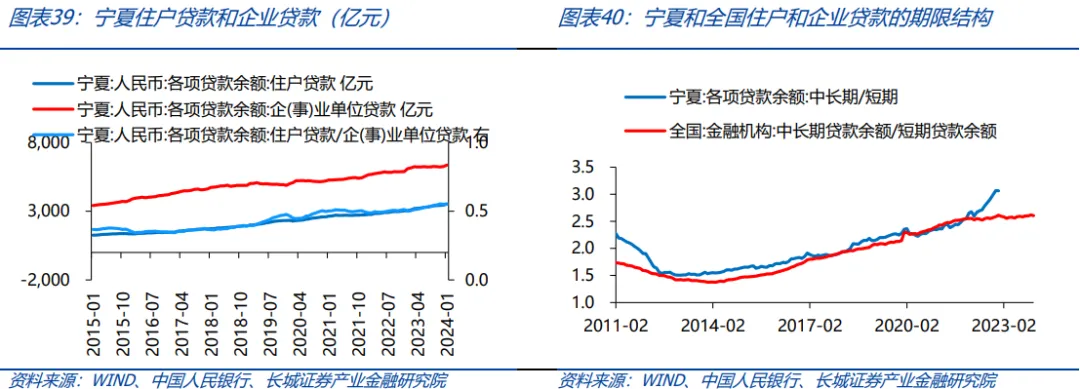 从贷款端看,企业贷款为主,中长期比例较高。2015年至今,住户端贷款与企业贷款均保持平稳增长态势,住户贷款始终低于企业贷款,但增速持续快于企业。从期限结构来看,宁夏中长期贷款与短期贷款之间的比例逐年攀升。并且在近几年高于全国水平,表明企业投资积极性高。2022年12月,宁夏中长期贷款余额是短期贷款余额的3.06倍;而全国同期来看,中长期贷款余额是短期贷款余额的2.61倍。