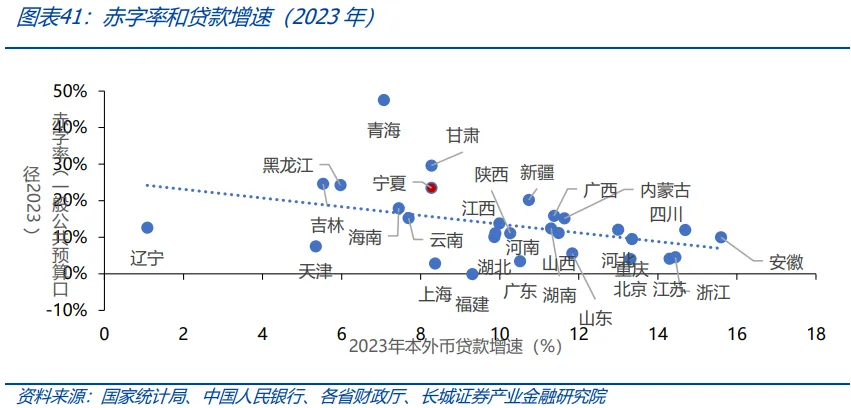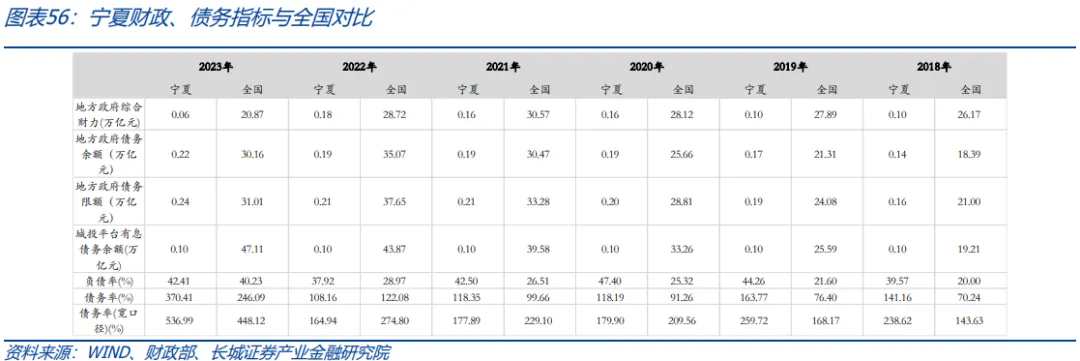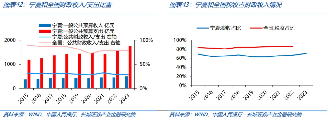 赤字率相对较高,贷款增速较低。2022年,赤字率(一般公共预算赤字/GDP)为22.24%,全国31省市中排名第6位;本外币贷款增速6.01%,排名倒数第7位。宁夏GDP总量在全国31省市中排名倒数第3,仅高于青海和西藏。因此,国家大力扶持宁夏经济发展,体现之一就是较高的地方政府赤字率。