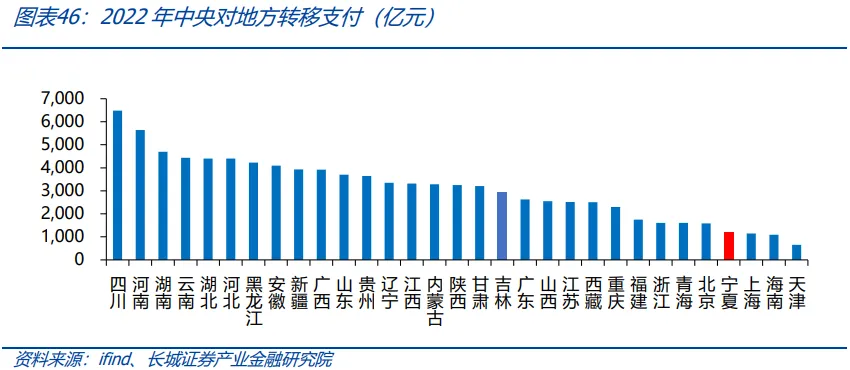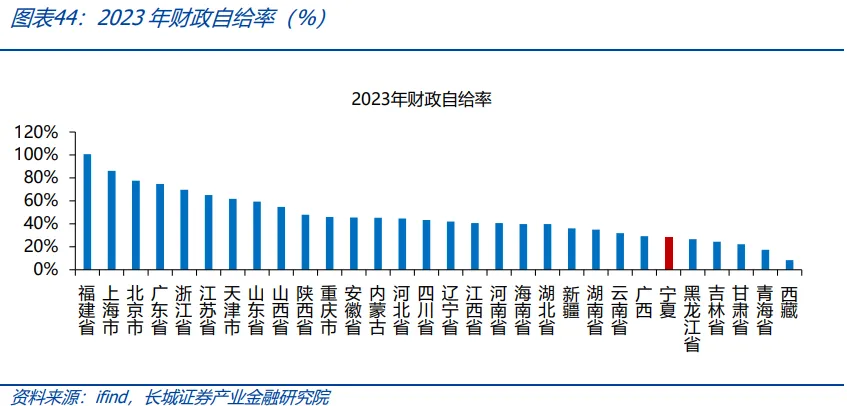 财政自给率处于全国下游水平,对中央转移支付依赖较高。我们以一般公共预算收入占支出的比例大致衡量财政自给率,宁夏财政自给率一直处于较低水平,近十年平均30.7%,2023年财政自给率在全国31个省份中处于尾部。对中央转移支付的依赖较高,2022年中央对宁夏转移支付1191.7亿元,占宁夏当年一般公共预算收支缺口的105.7%。