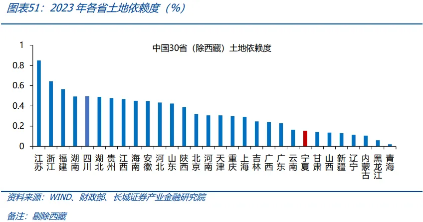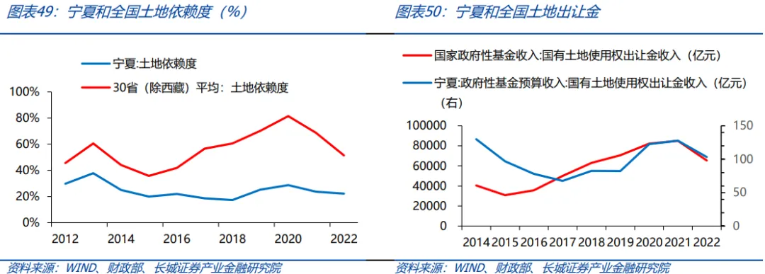 土地依赖度低。我们以成交土地出让金占地方公共财政收入的比例来近似衡量土地依赖程度,近十年宁夏财政对土地出让的依赖度低于全国平均水平。尤其是近年受土地市场低迷影响,土地出让金大幅减少,导致2023年财政土地依赖度明显下降至近三年来的最低水平,为15.6%。2023年,宁夏土地依赖程度在30省市中(除西藏)排名第23位,低于全国平均水平的39.4%。实际上2020年后,全国房地产市场进入调整周期,全国土地出让金下降,对地方财政形成一定压力。不过近年来财政土地依赖度较低,影响相对有限。