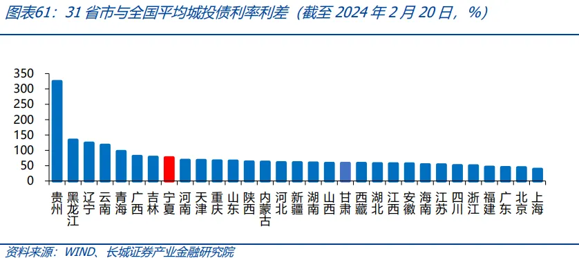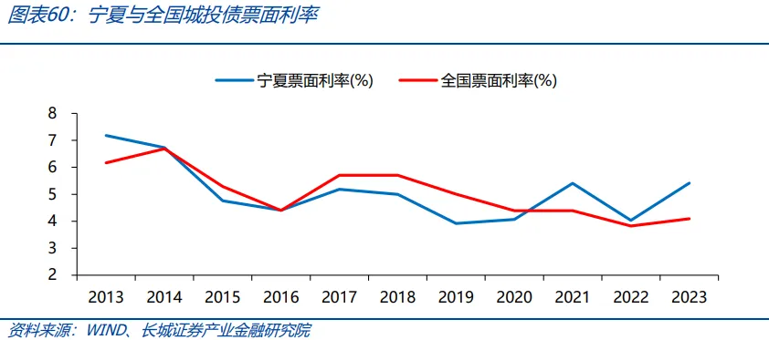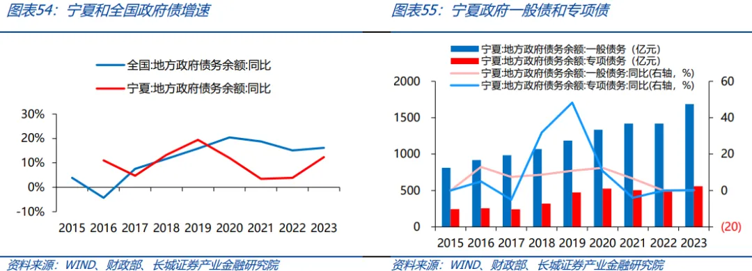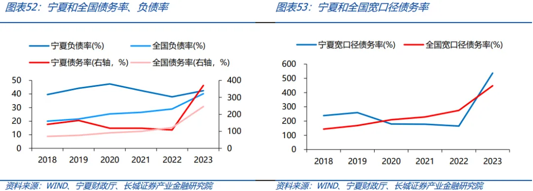 从显性债务看,2018-2022年宁夏经济对债务的以来程度较低,直到2023年偿债压力有所上升。2017-2018年,地方政府债务同比与全国平均水平基本持平,2019年后增长水平低于全国。2023年债务率的飙升是由于地方政府综合财力的下降。从隐性债务角度看,城投债余额一直处于较为平稳的水平,影响宽口径债务率的主要也是分母端波动。总体来看,2023年前宁夏债务控制结果较为优秀,《宁夏金融运行报告》指出,这是 “高效优化调配财政资源,用好用足中央直达资金”的结果。