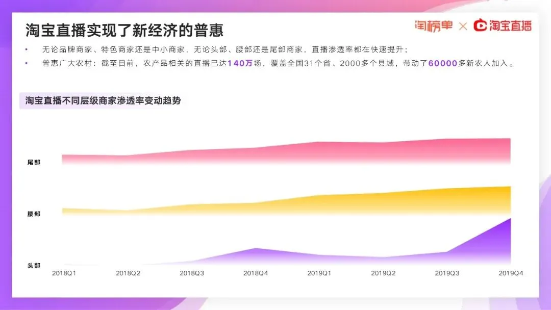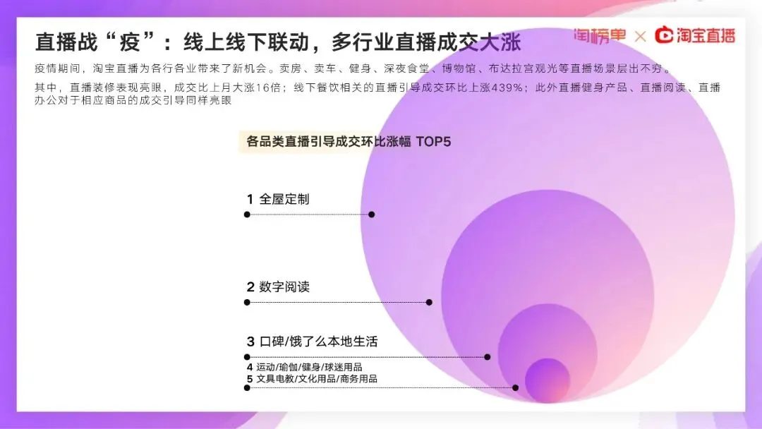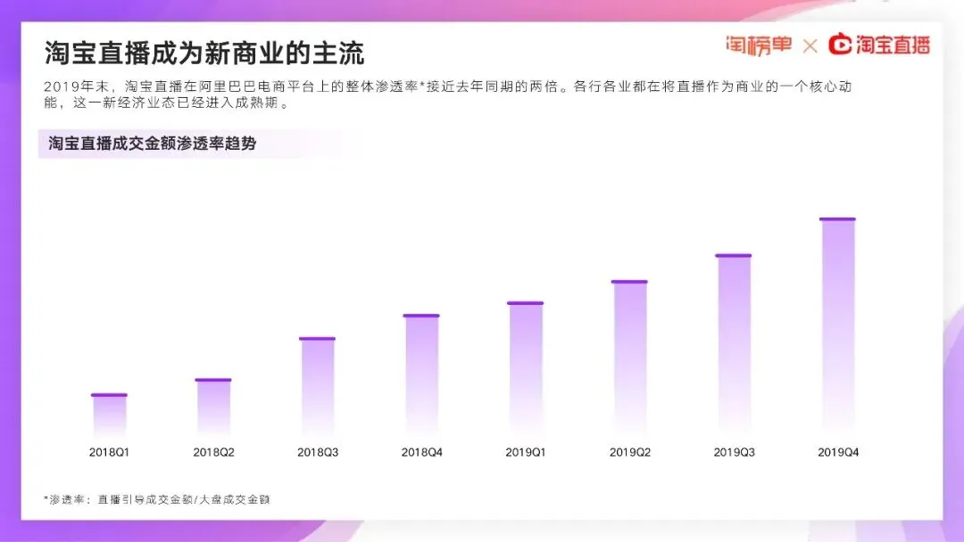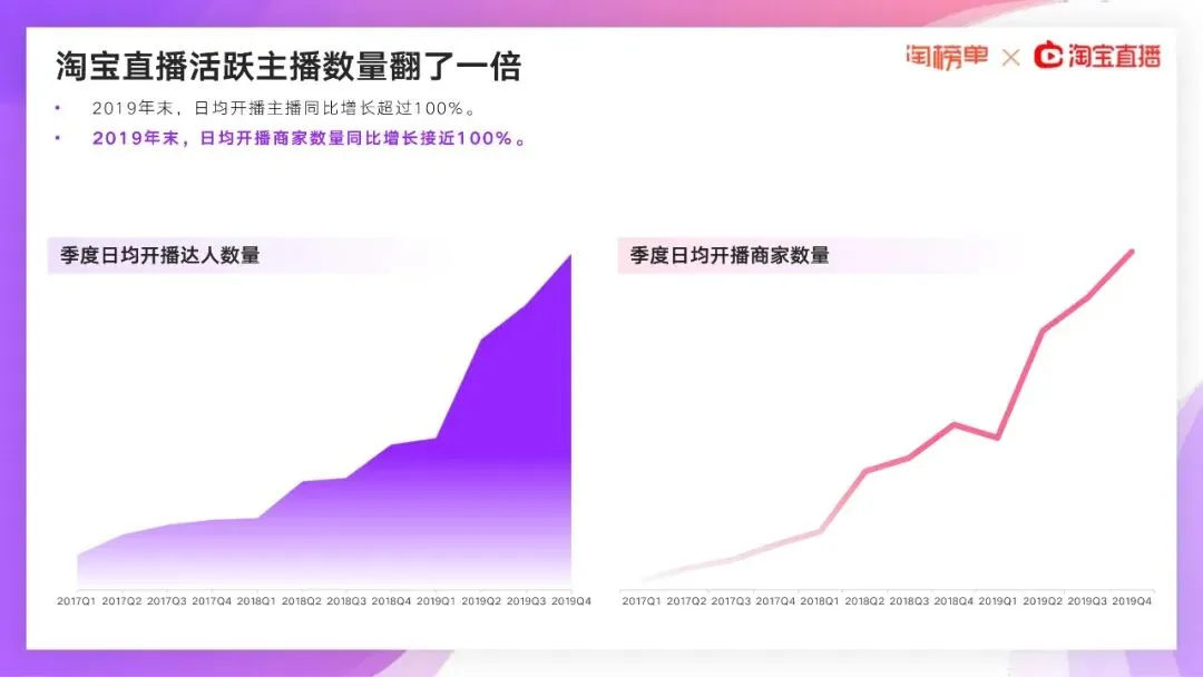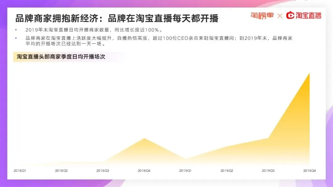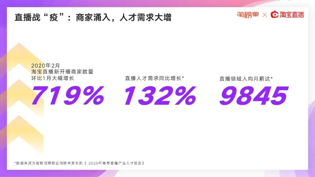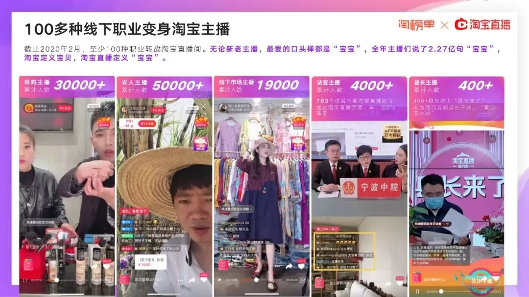 在2020年2月11日,淘宝直播就宣布:所有线下商家都能0门槛、免费开播,甚至没有淘宝店也能先开淘宝直播。当月新开播商家数量比1月份飙升719%,超过100种职业在1个月内转战淘宝直播间。