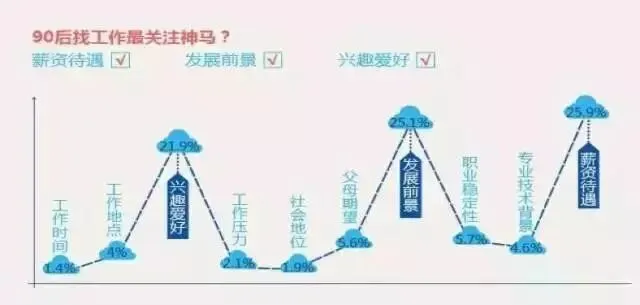 90后中,有83.5%的人表示不在乎加班。在找工作时,90后对工作时间关注度仅为1.4%,对社会地位的关注度仅为1.9%,位列前三的影响因素依次为:薪资待遇、发展前景、兴趣爱好。90后是“努力工作,努力玩”的一代。刚步入职场,对职场充满热情的的90后不在乎是否加班,更加注重薪资待遇,关注工作是否有挑战性,并希望对他们的工作成绩即时肯定。