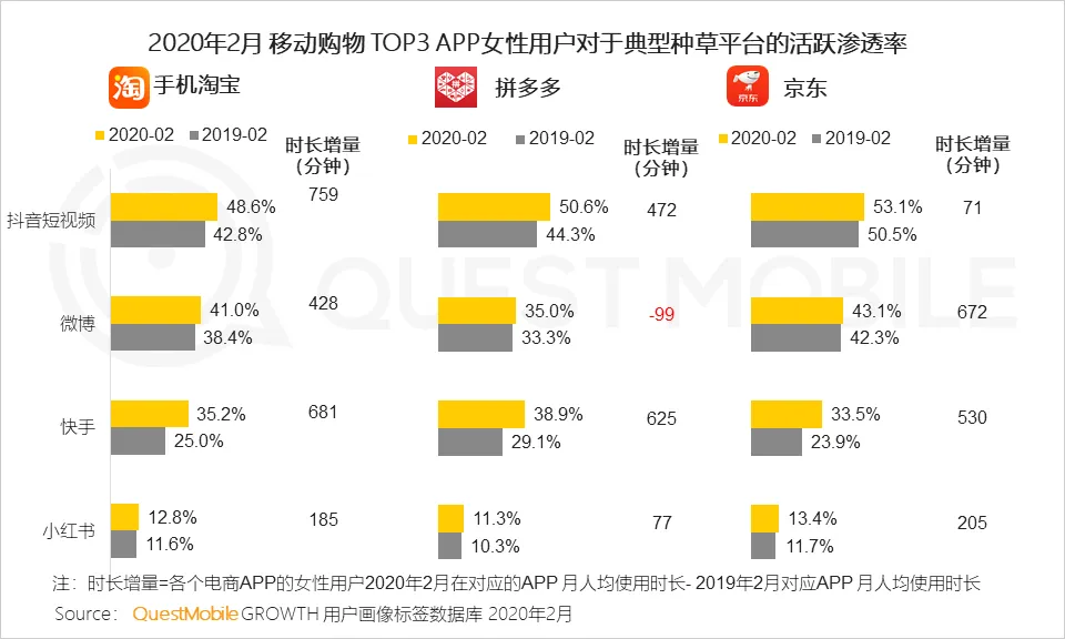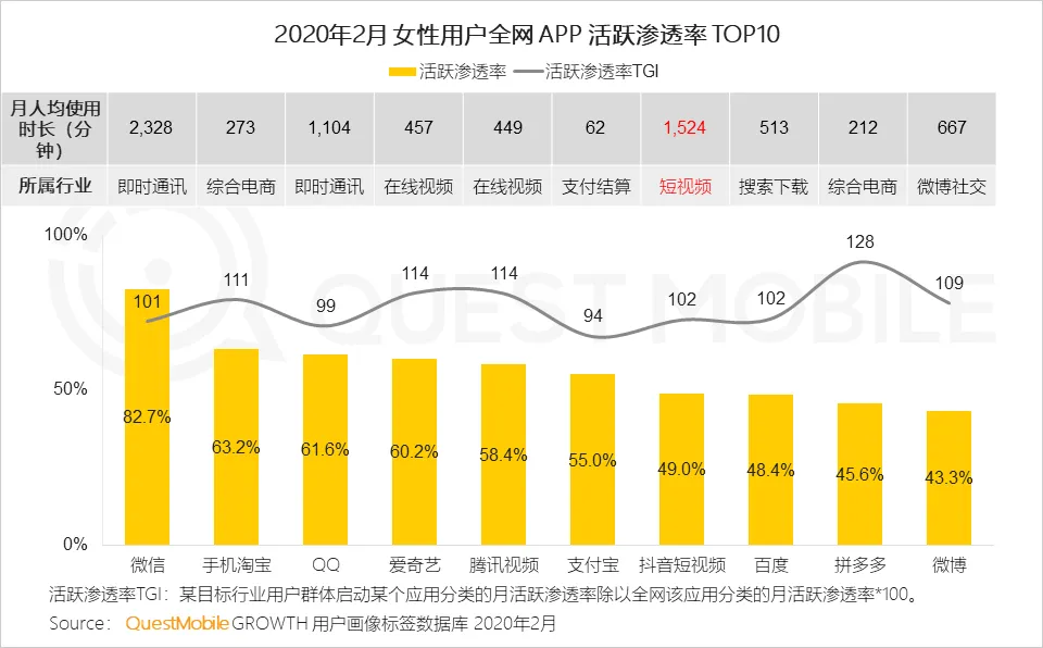 我们的数据显示,2020年2月疫情期间,女性用户规模虽然涨幅不大(保持在5.4亿左右),但是,月人均使用时长同比增长了42.7%,大大拉高了全网用户时长均值,同时,女性用户打开的APP数量也从22个增加到了近25个!从领域渗透上看,短视频、综合资讯用户渗透率增加均超过9个百分点。从细分行业月人均使用时长增长率来看,由于疫情因素,效率办公、K12分别激增374%、161%,心疼那些一边在家工作一边还要陪娃上网课的老母亲。具体来看,2020年2月,女性用户活跃渗透率Top10 的APP分别为微信、手机淘宝、QQ、爱奇艺、腾讯视频、支付宝、抖音、百度、拼多多、微博。这当中,电商APP占据两席。